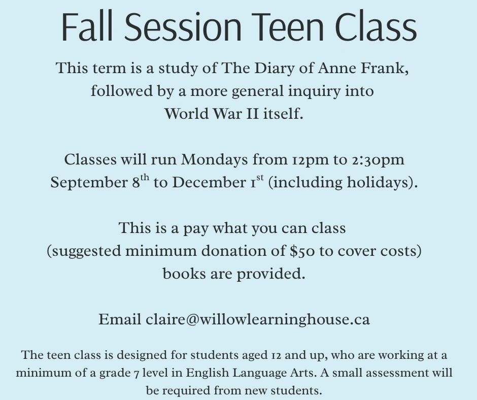 Are you looking for academic enrichment for your homeschooler? This year Willow Learning House is offering a new class that is geared specifically towards older students, aged 12 and up and operating at a grade 7 level or higher in English L:anguage Arts.